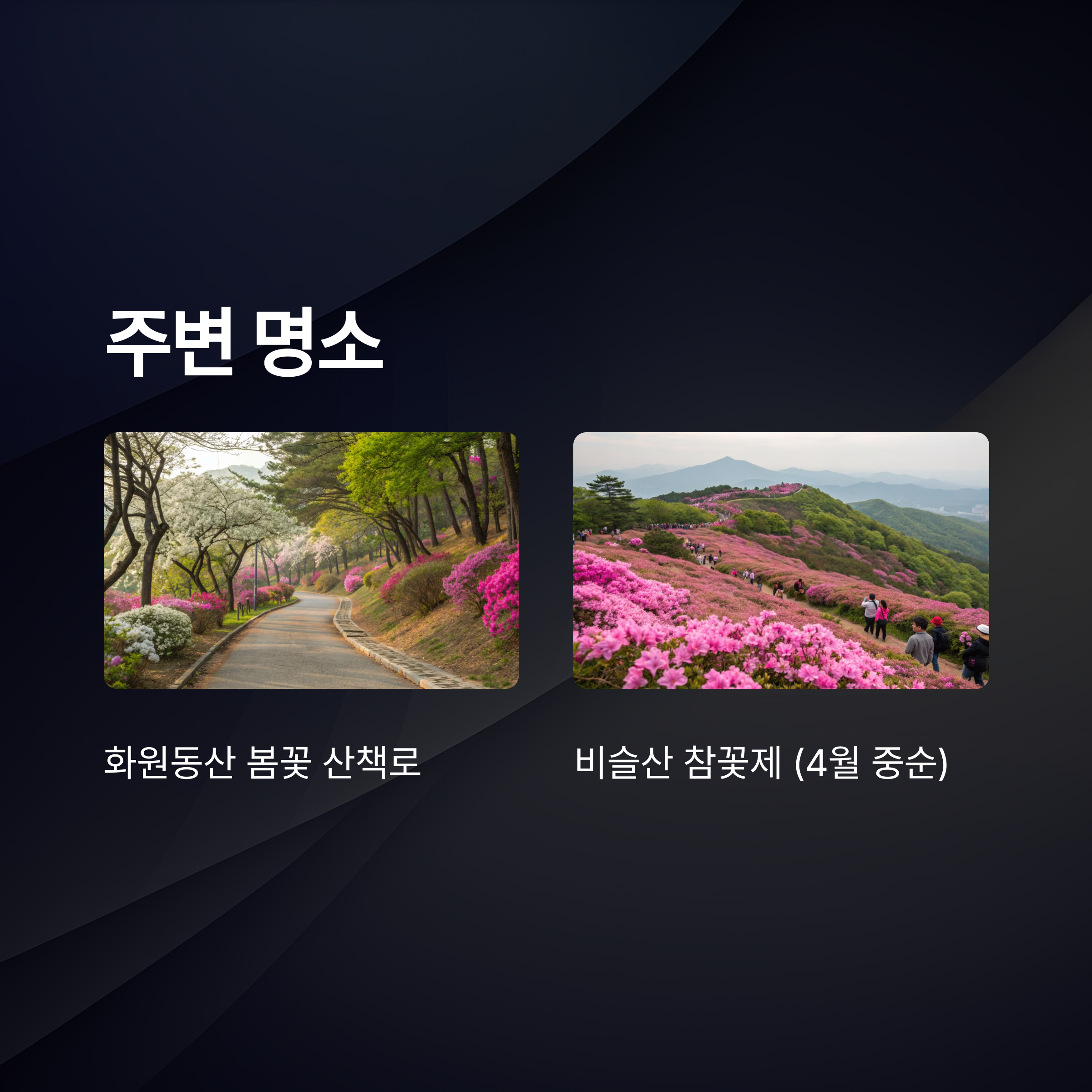 | 홍매화, 청매화, 황매화 등 다양한 매화를 감상할 수 있습니다. | 무료 주차장은 약 20대 정도 주차 가능하며, 주말에는 일찍 방문하는 것이 좋습니다. | 대곡역에서 하차 후 도보 15-20분, 마을버스 5번을 이용하면 본리세거지 입구에서 하차 가능합니다. |