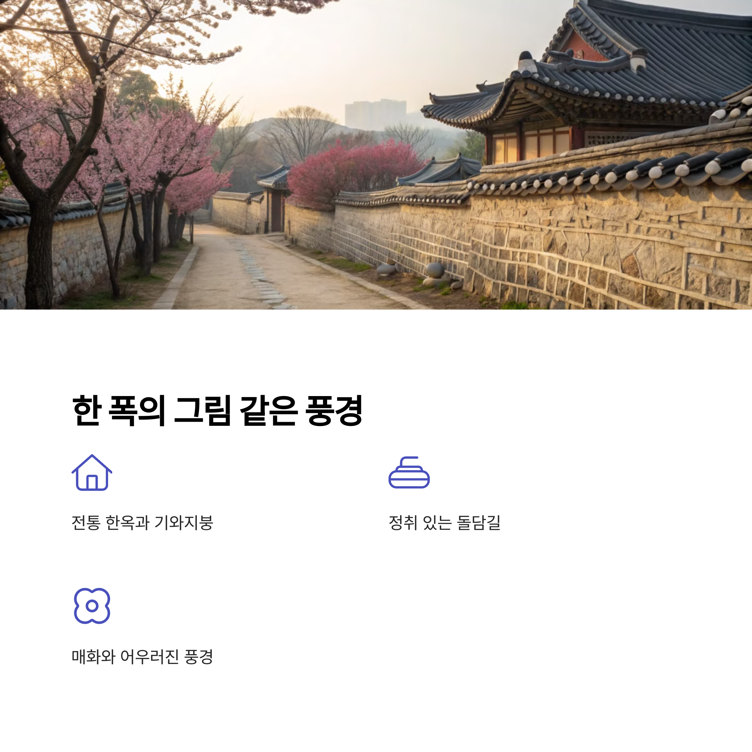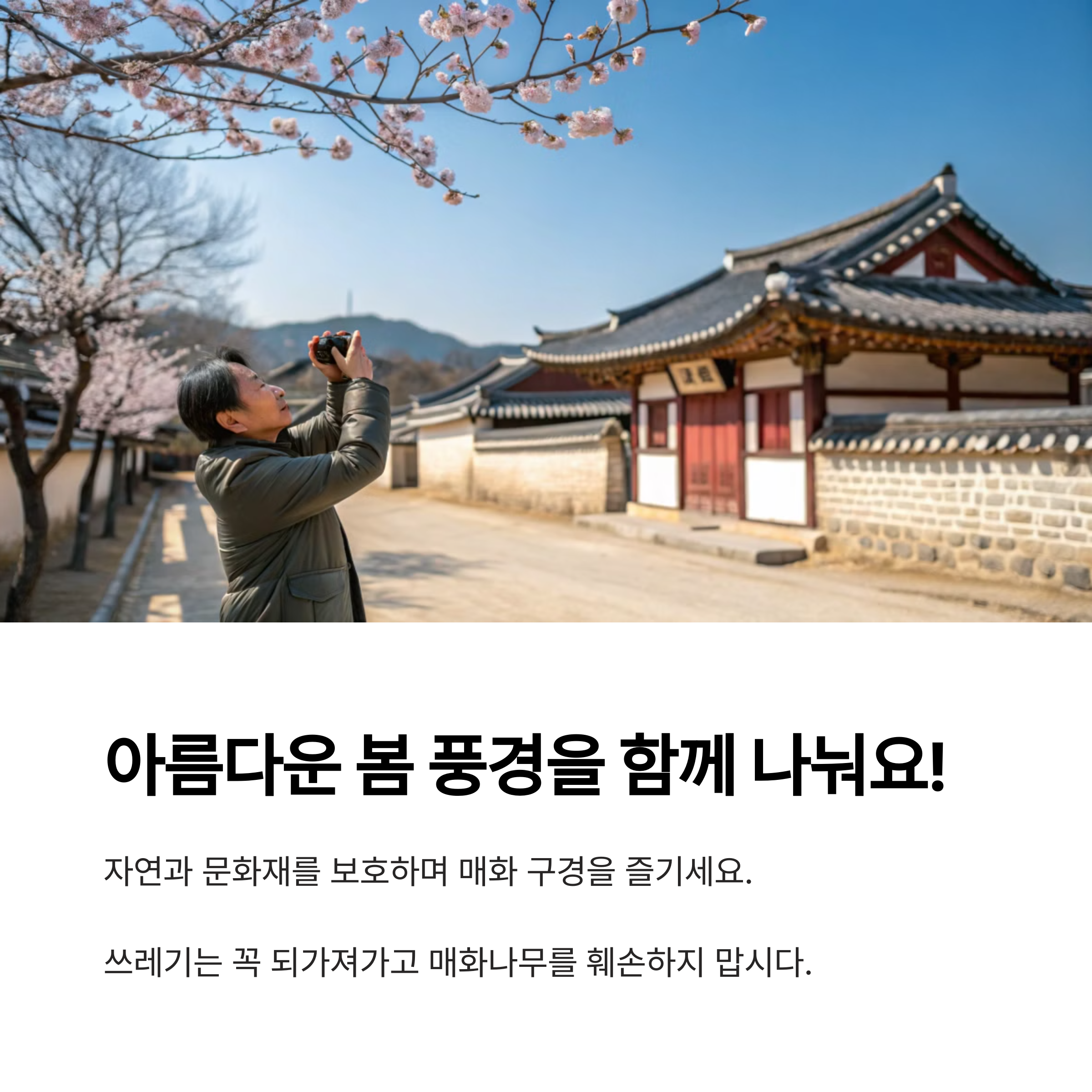 매화꽃과 함께 한옥, 기와지붕, 돌담길이 어우러져 만들어지는 이곳의 풍경은 마치 그림 속에 들어간 듯한 느낌을 줍니다. 특히, 길을 따라 펼쳐진 돌담길과 한옥들이 매화꽃을 배경으로 하는 모습은 예술 작품과도 같습니다. 많은 사람들이 이곳에서 사진을 찍고, 그 아름다움을 기록하며 기억에 남길 수 있습니다. 또한, 그곳에서 흘러나오는 바람과 꽃향기는 방문객들에게 큰 위로와 힐링을 선사합니다.