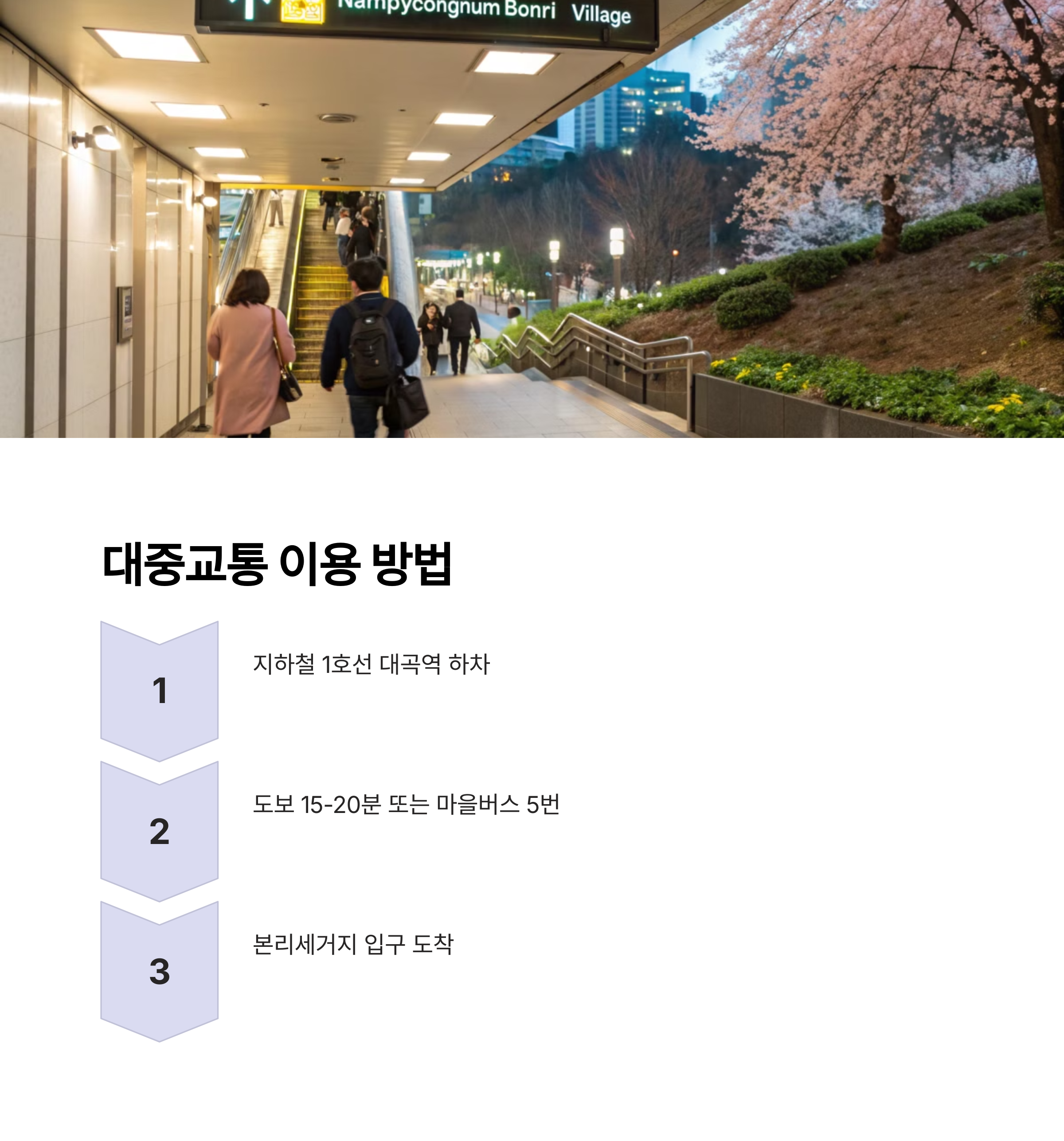 | 홍매화, 청매화, 황매화 등 다양한 매화를 감상할 수 있습니다. | 무료 주차장은 약 20대 정도 주차 가능하며, 주말에는 일찍 방문하는 것이 좋습니다. | 대곡역에서 하차 후 도보 15-20분, 마을버스 5번을 이용하면 본리세거지 입구에서 하차 가능합니다. |