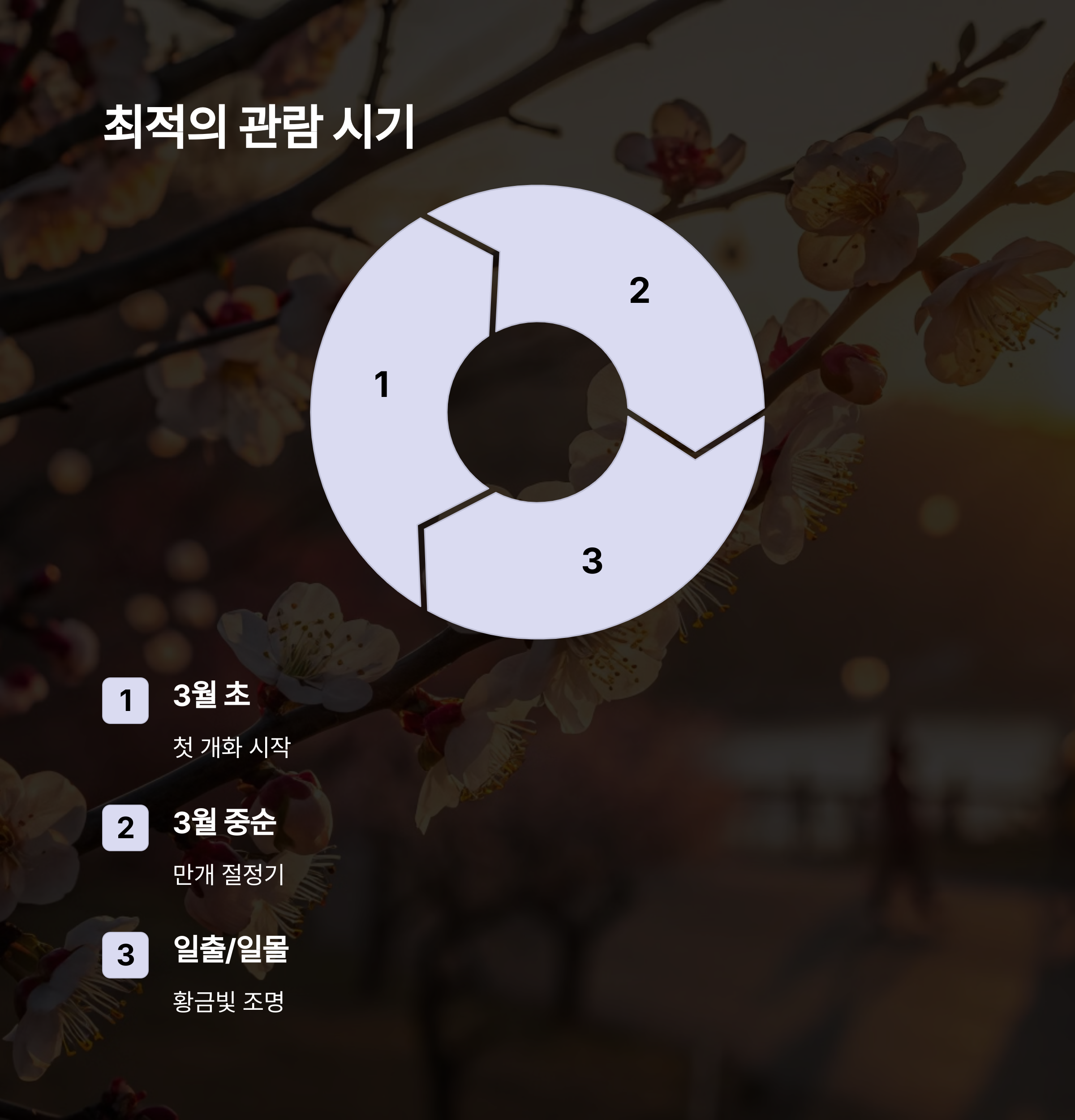 | 매화 | 홍매화, 청매화, 황매화 등 다양한 매화를 감상할 수 있는 명소 |