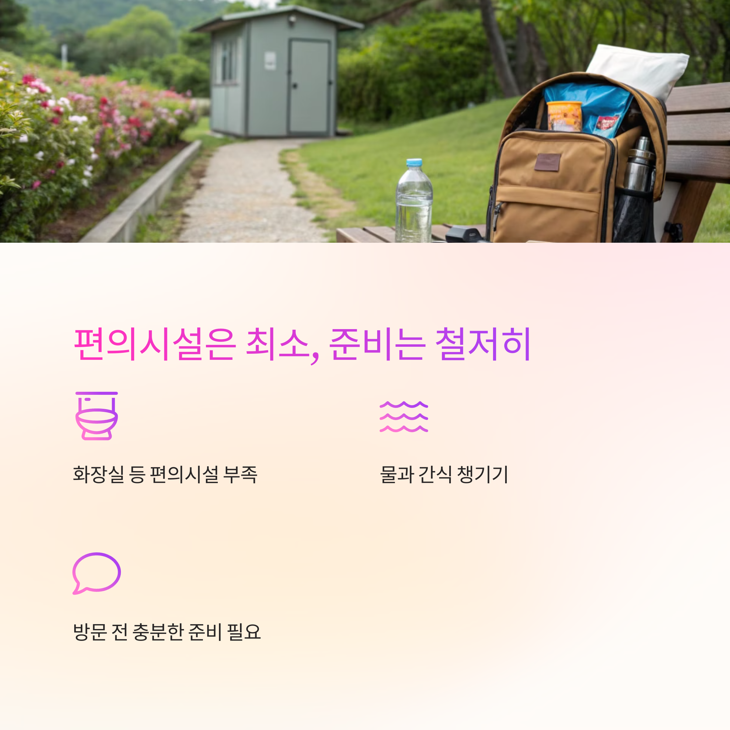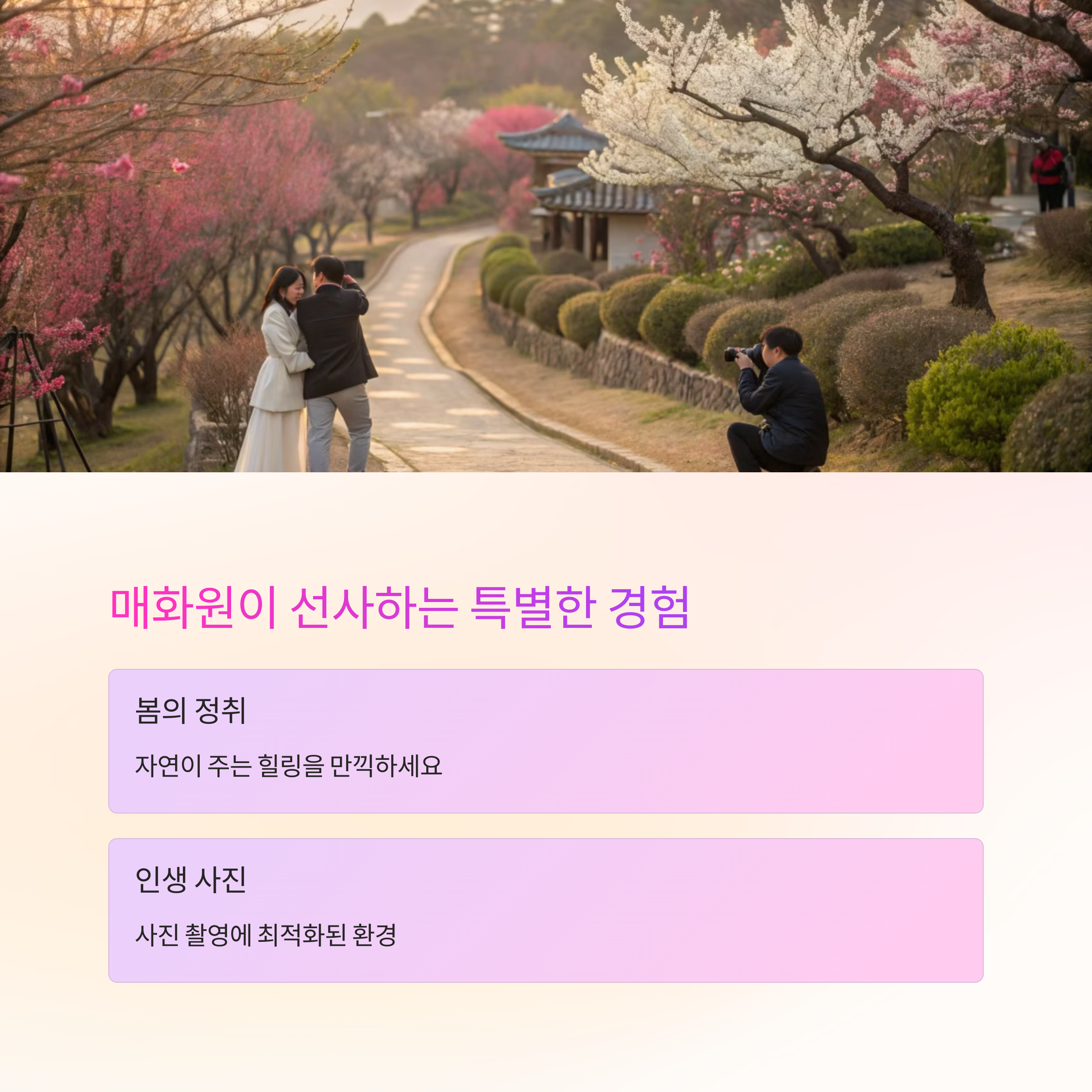 | 기장 매화원은 매년 봄철에 개방됩니다. | 홍매화와 백매화가 어우러져 아름다운 풍경을 이룹니다. | 화장실 등 편의시설 부족으로 방문 전 준비가 필요합니다. |