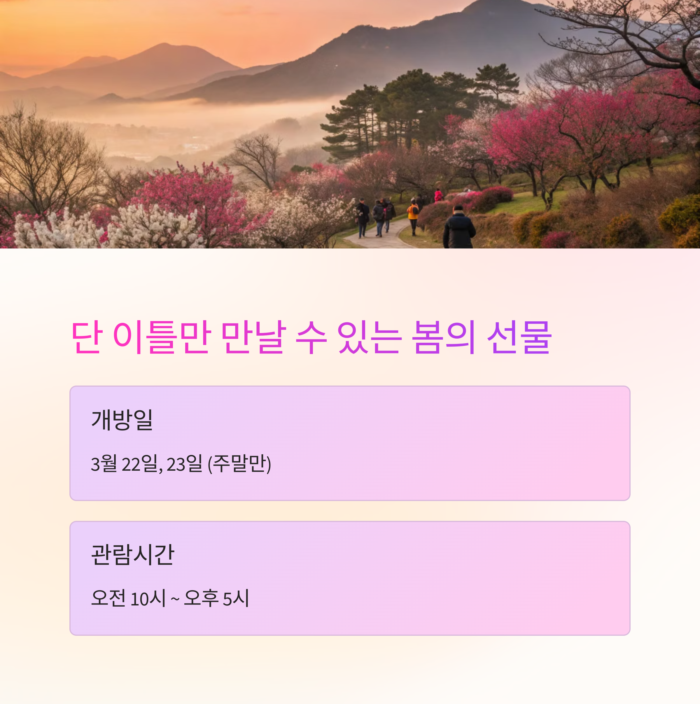 | 매화 개방일 | 3월 22일, 23일 주말 한정 개방 |