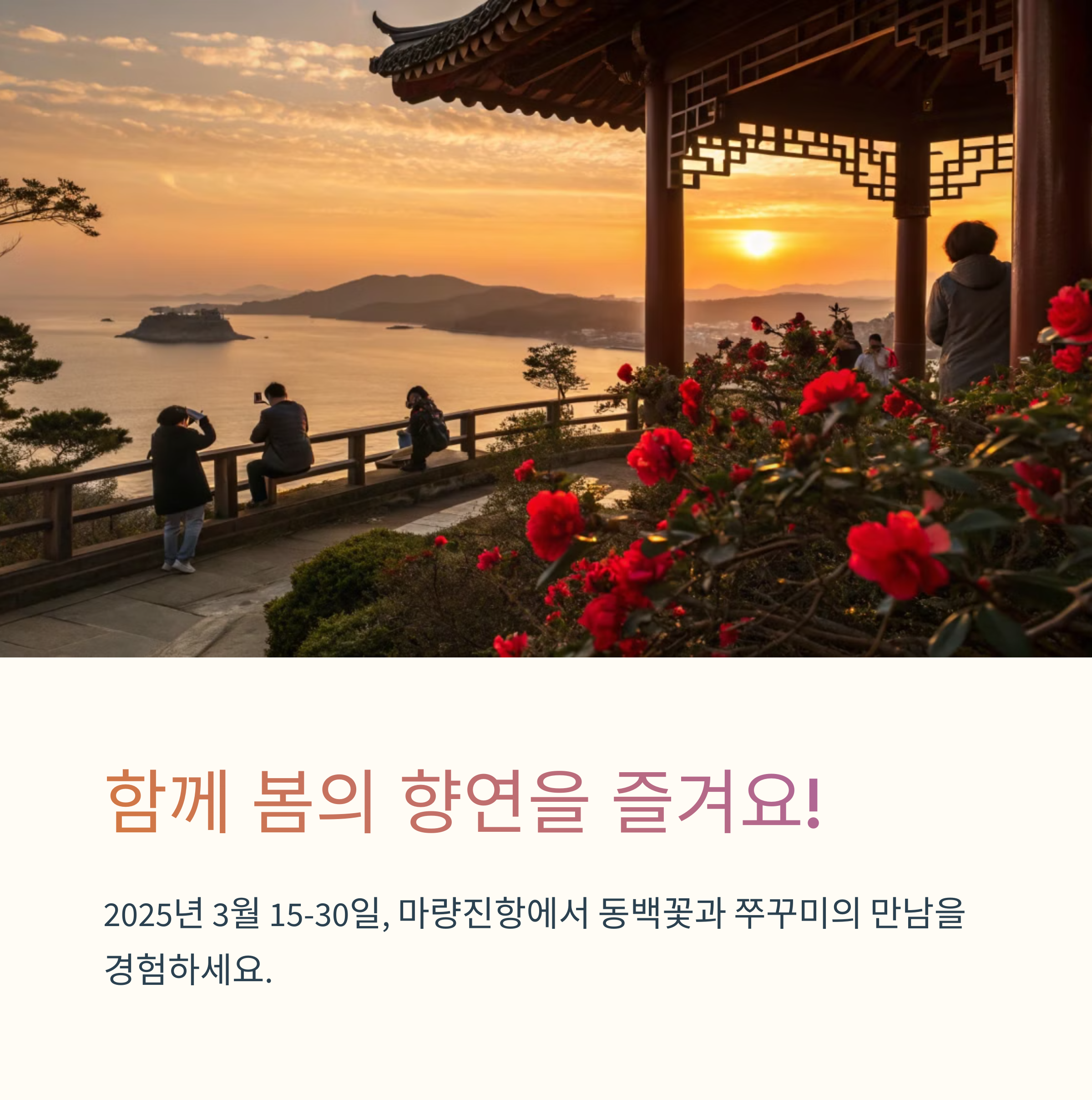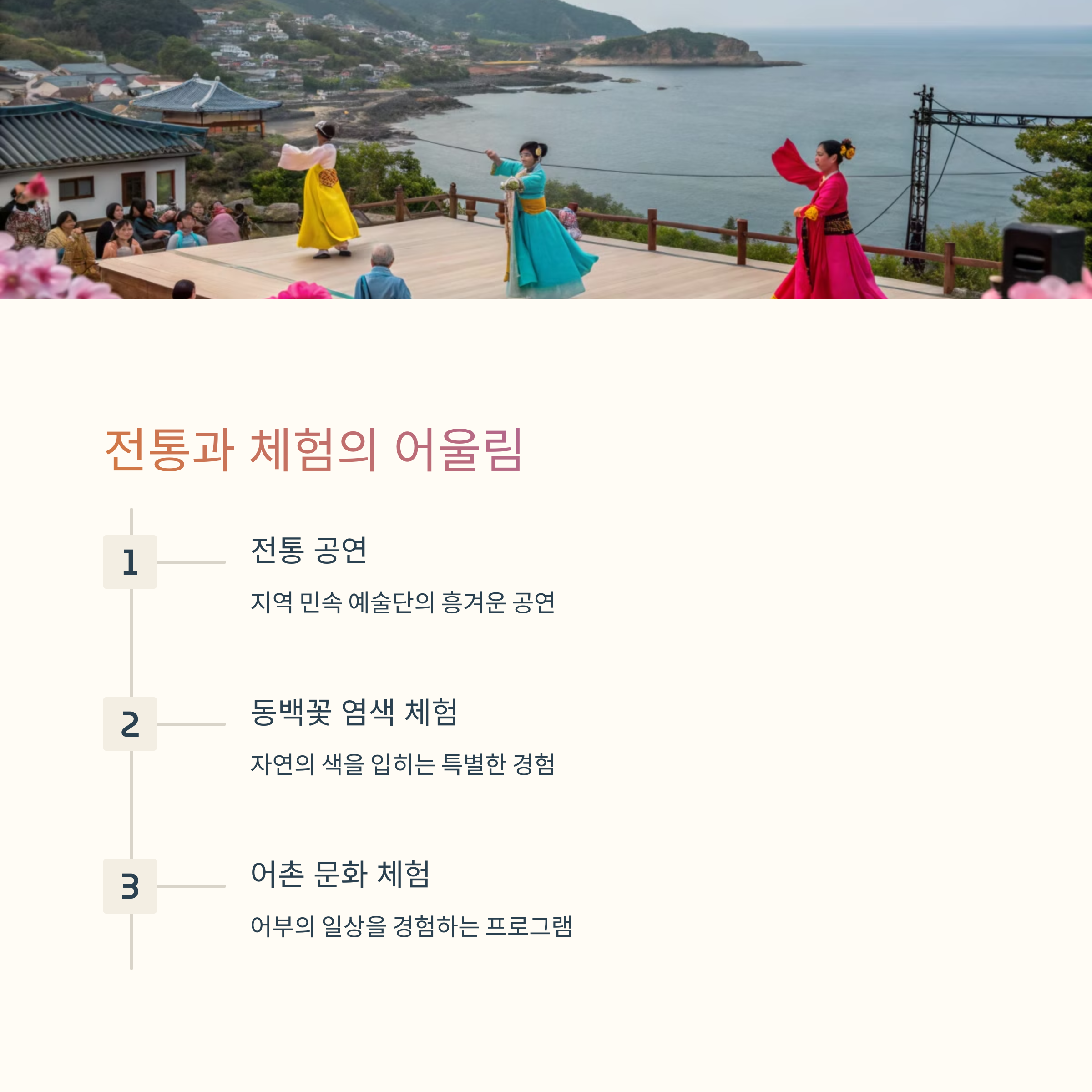 | 사진 명소로도 인기가 높은 동백꽃 배경 | 가족 단위 참여가 가능한 체험 프로그램 | 일몰 감상의 최적 장소로 손꼽힘 |