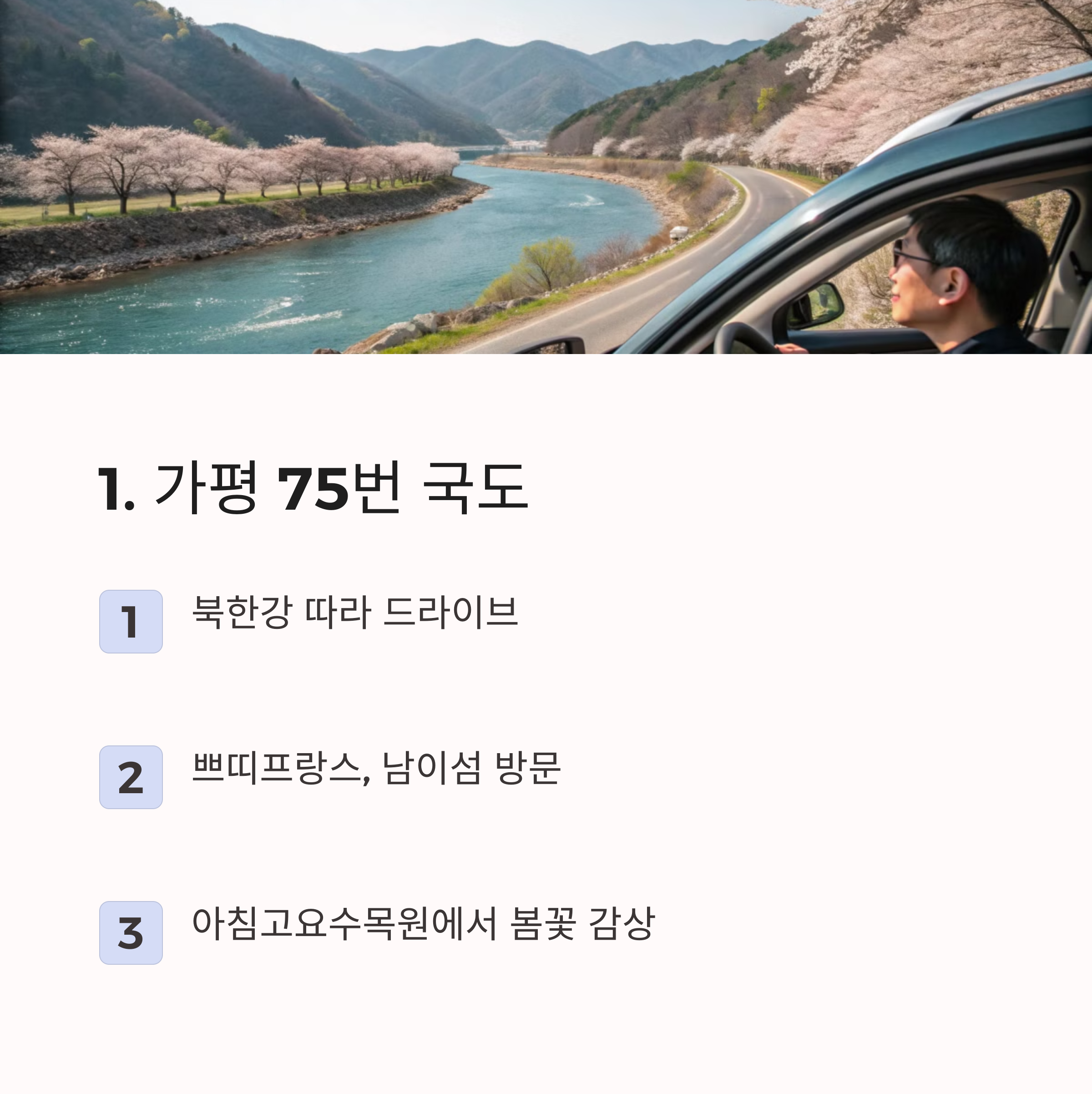 | 가평 75번 국도 | 북한강을 따라 드라이브하며 다양한 자연과 테마파크를 만끽할 수 있습니다. |