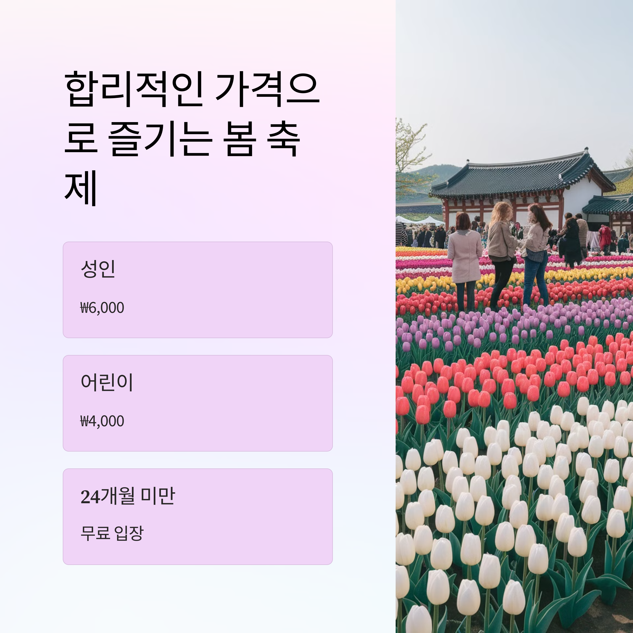 입장료는 성인 6,000원, 어린이 4,000원이며, 24개월 미만은 무료입니다. 제주 여행을 계획 중이라면, 보롬왓 튤립축제에서 아름다운 봄꽃과 함께 특별한 봄 여행을 경험해보시기 바랍니다.