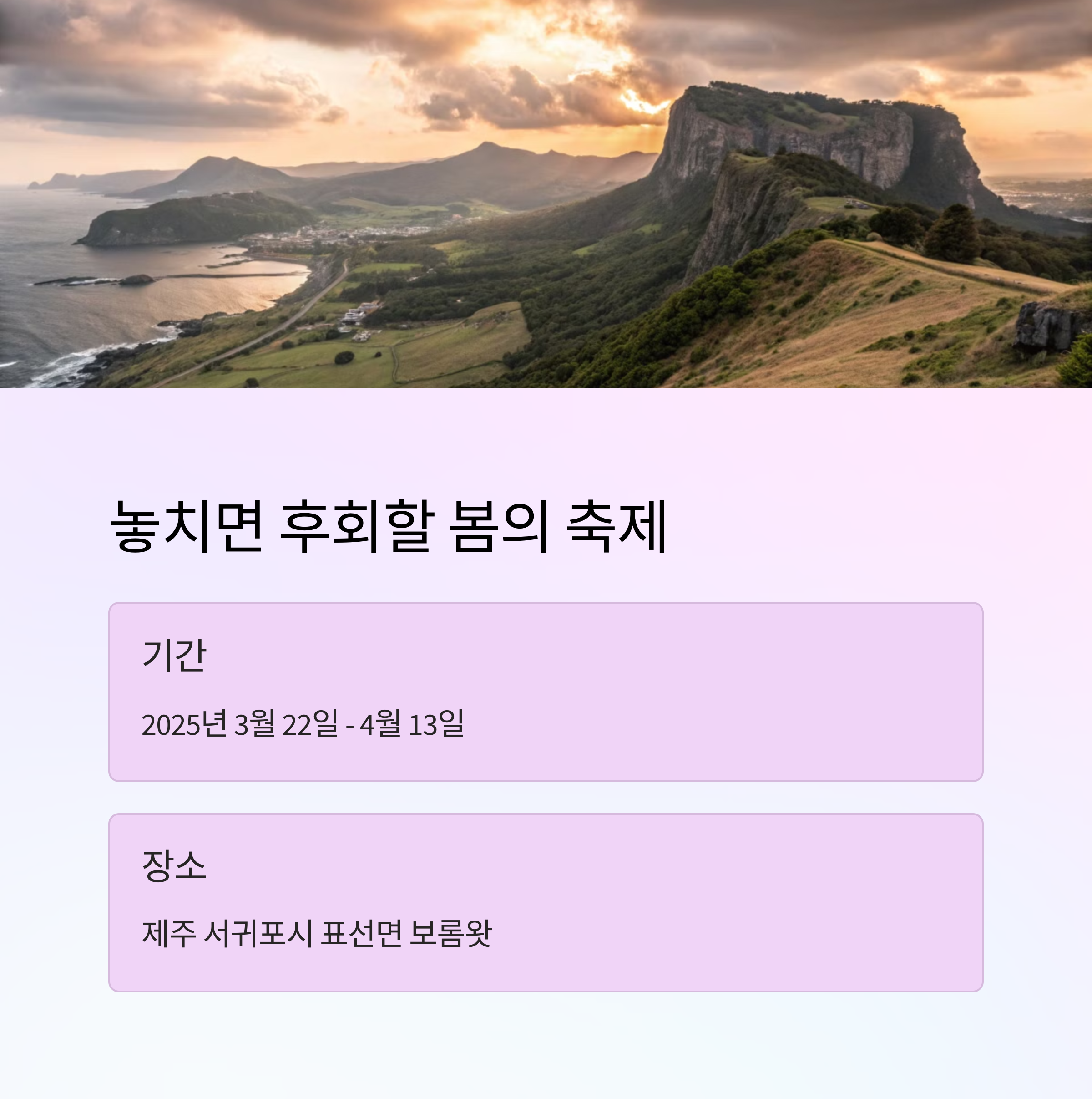 2025 제주 보롬왓 튤립축제는 제주의 아름다운 봄을 만끽할 수 있는 특별한 기회입니다. 봄꽃을 즐기며 제주의 매력을 한껏 느낄 수 있는 이 축제는 가족, 친구들과 함께 소중한 추억을 만들 수 있는 최적의 장소입니다. 올해 봄, 보롬왓 튤립축제에서 화려한 튤립과 로맨틱한 야경을 즐기며 특별한 봄 여행을 떠나보세요.