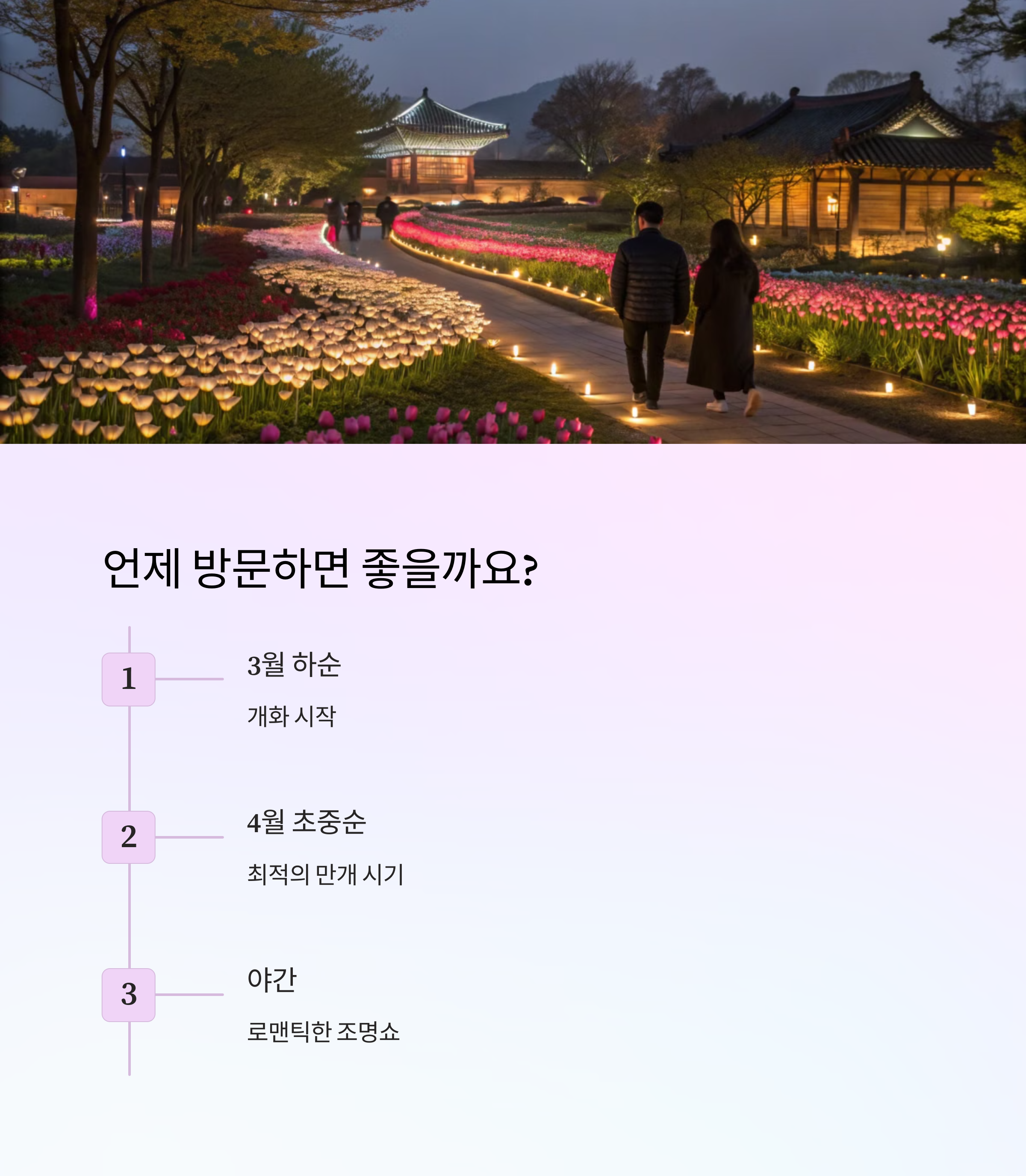 축제에서는 특히 튤립이 만개하는 4월 초중순에 방문하는 것이 가장 좋습니다. 이 시기에 보롬왓은 다양한 색상의 튤립이 가득하여 관광객들에게 환상적인 풍경을 제공합니다. 또한, 잘 조성된 포토존과 산책로에서는 그야말로 아름다운 추억을 남길 수 있습니다. 특히 야경은 더 특별합니다. 야간에는 튤립밭에 조명이 설치되어 로맨틱한 분위기를 연출하며, 황홀한 조명쇼는 관람객들에게 잊지 못할 경험을 선사합니다.